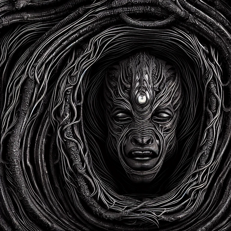 symmetrical painting of ribbed surreal abandoned sculpture of faceless black alien king, covered with black spinal ribbed tentacles black flesh black meat on black exoplanet, soft dark black bloom, dream - like heavy mysterious atmosphere, in the wastelands, baroque portrait painting, perfect composition, beautiful detailed intricate insanely detailed octane render, unreal engine 5, trending on artstation, 8 k artistic photography, photorealistic, soft natural volumetric cinematic perfect light, chiaroscuro, award - winning photograph, harsh flash photo at night, masterpiece, raphael, caravaggio, greg rutkowski, beeple, beksinski, giger