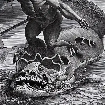 Man eating 300 pound catfish coming out of the water carrying hooks embedded in its face . Murdering eyes hyper realistic definition 8k