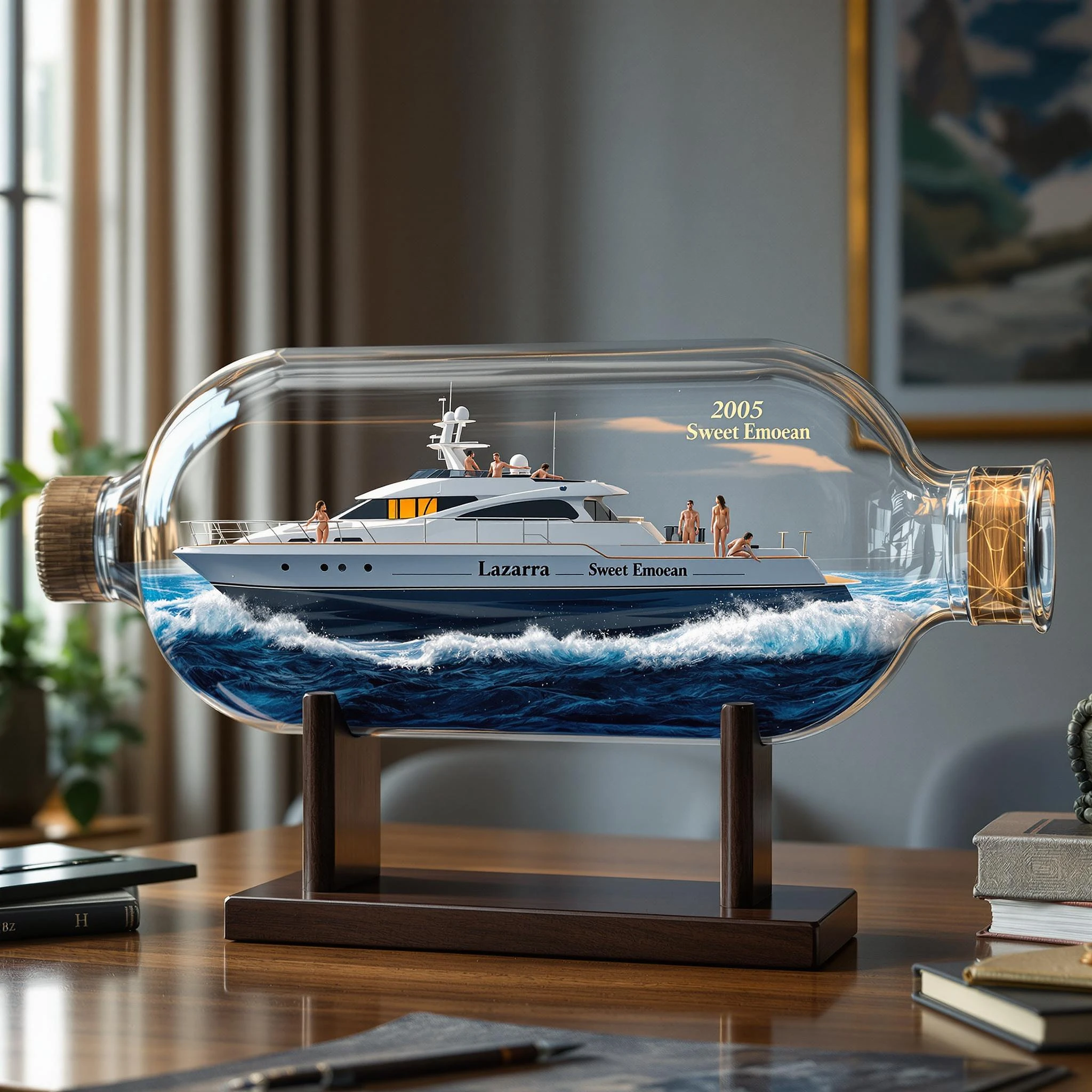 A realistic ship in a bottle, featuring a ((2005 68 foot Lazarra enclosed fly bridge) ) luxury super yacht scene. The yacht is busy with a few naked people on deck. The yacht name "Sweet Emoean" is visible on the side. The scene includes cresting waves, capturing a vibrant, dynamic moment. The bottle sits on a stand as a decoration on a professional-looking desk in a well-appointed home office. Highly detailed, ultra-realistic, cinematic, 8k. Negative prompt: text, logos, watermarks, out of frame, ugly, extra limbs, extra hands, extra feet, extra fingers, bad anatomy, blue hull