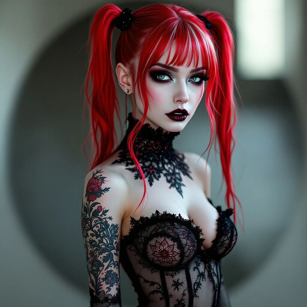 instagram profile picture, should be text ''InkkandPetals'' and include within the circle: ''A realistic, full-body photo of a fit, thin, perfect-bodied, very pale woman. She has neon red hair with white highlights styled in long, elegant pigtails. Her makeup is gothic: black with red and white accents, black lipstick, and dramatic eyeliner. She has highly detailed gothic tattoos covering her arms, legs, and back. She wears a sheer, black lace gown with intricate red designs, tightly hugging her form. ''