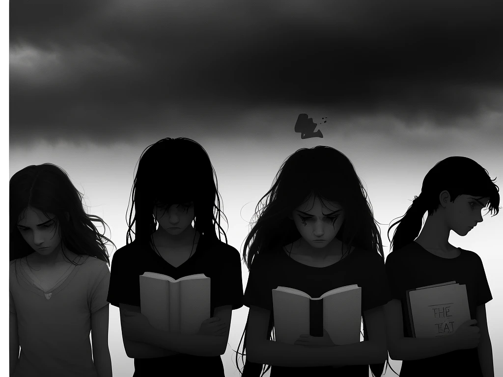 Here’s a prompt for generating the book cover image: "Design a book cover focused on adolescent anxiety. The image should convey the struggles and emotions of teenagers dealing with anxiety. The central figure should be a teenage silhouette or a group of teens with expressions of stress or concern. The background should be moody, possibly with abstract elements like tangled lines or dark clouds to symbolize mental turmoil. The title 'Anxiety in Adolescents' should be prominent in bold, modern typography, with a color palette that reflects seriousness and hope. "