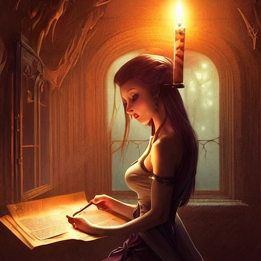 Attractive necromancer mistress looking through papers in a candle light at a spooky old attic, fantasy magic, blonde pin-up style hair, dark light night, intricate, elegant, sharp focus, illustration, highly detailed, digital painting, concept art, matte, art by WLOP and Artgerm and Greg Rutkowski and Alphonse Mucha, masterpiece
