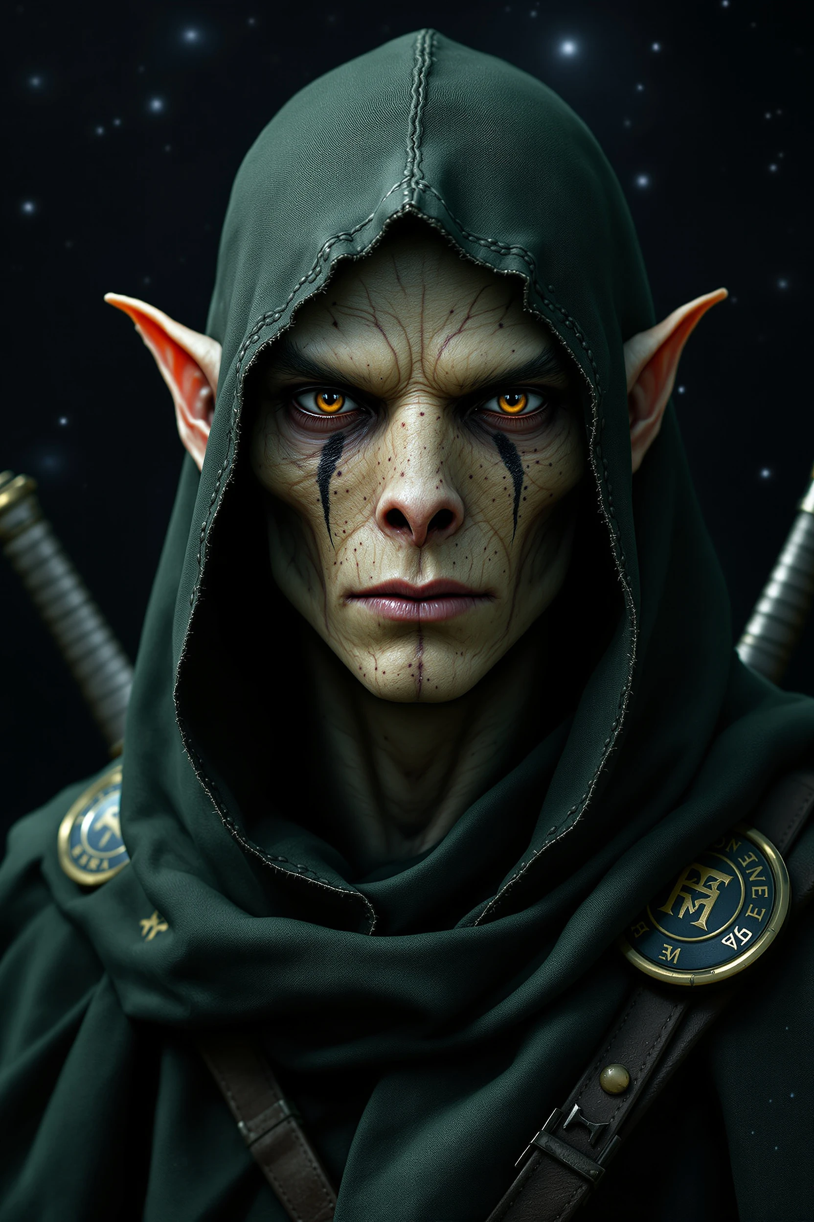 High resolution photography, fantasy character portrait, gaunt face, black freckles, young male githyanki, dark green hooded cloak, long serrated ears! , black eyes, noseless skull! ! , thin lips, pale yellow spotted skin, missing nose! ! , dual curved scimitars sheathed on back, open narrow nasal cavity, 8k, intricate detail, circular runes, photorealistic, realistic light, stary night sky