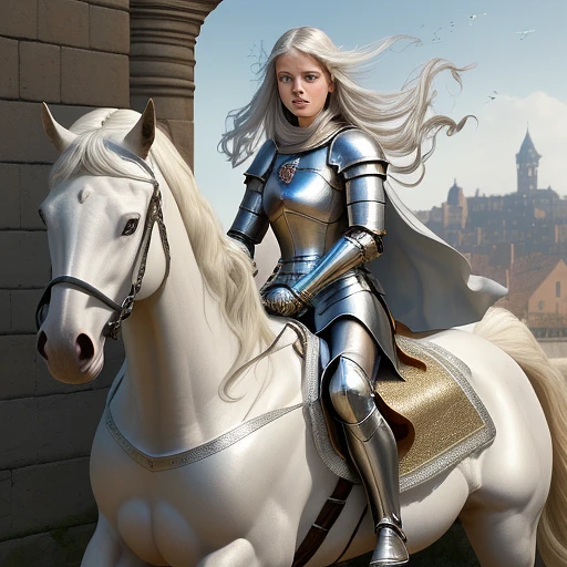 create image of woman, face teenager, Medieval female knight in action, riding on a white horse, heroic pose, (shiny silver armor:1. 2) , (insanely detailed, bloom:1. 5) , (highest quality, Alessandro Casagrande, Greg Rutkowski, Sally Mann, concept art, 4k) , (analog:1. 2) , (high sharpness) , (detailed pupils:1. 1) , (painting:1. 1) , (digital painting:1. 1) , detailed face and eyes, Masterpiece, best quality, (highly detailed photo:1. 1) , 8k, photorealistic, (long brown hair, braided hairstyle, intense look:1. 1) , (young woman:1. 1) , By jeremy mann, by sandra chevrier, by maciej kuciara, sharp, (fit body:1. 1) , realistic, real shadow, (medieval background:1. 2) , (by Michelangelo) , holding a sword (glowing sword:1. 1) , (radiant light:1. 2) , (motion blur:1. 2) , (dramatic pose:1. 1) , (female empowerment:1. 1) , (action-packed:1. 2)