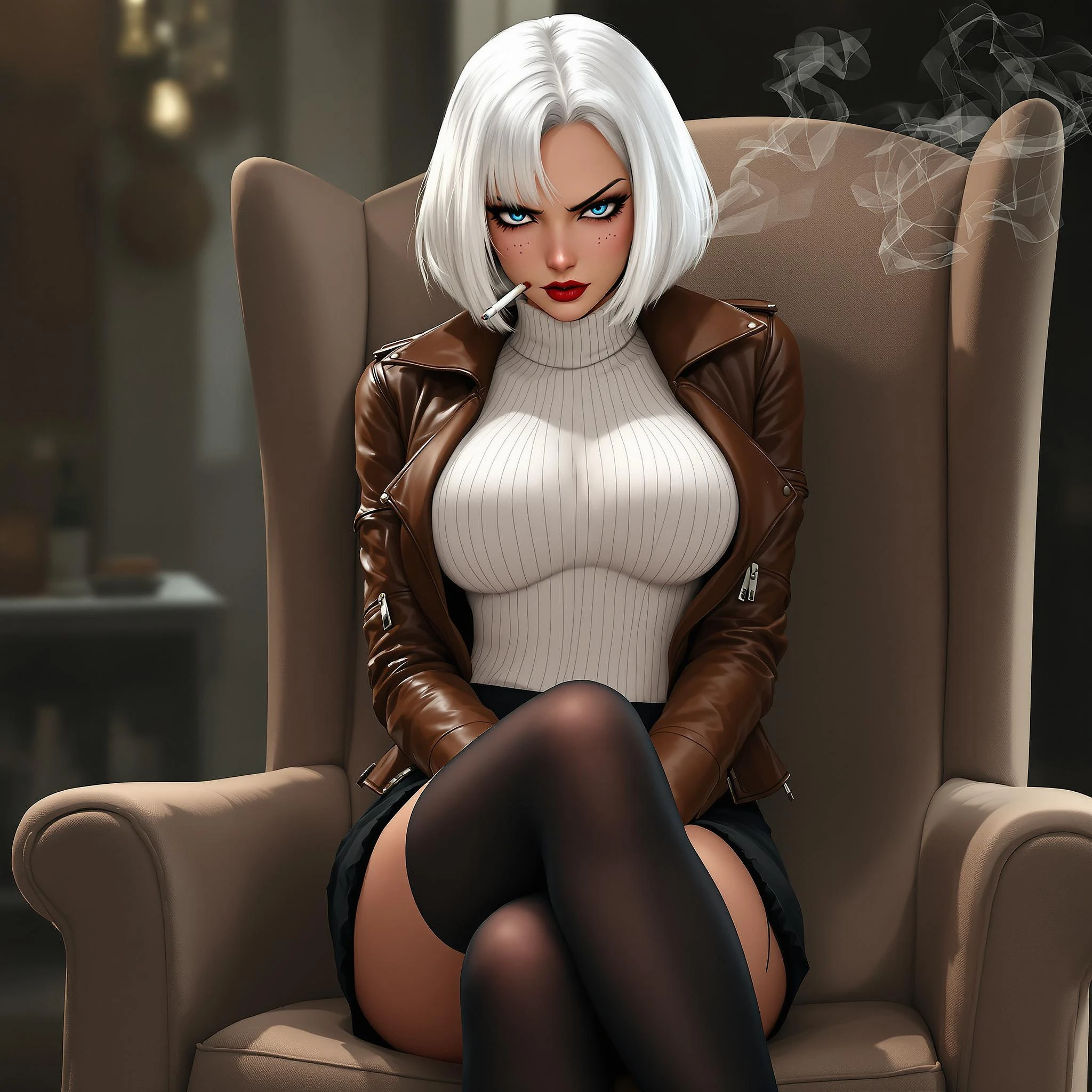 anime style, woman, white hair, bob cut, blue eyes, freckles, red lips, white sweater, tight sweater, short leather jacket, brown leather jacket, black tight skirt, black stockings, black high heels, angry expression, sitting on a chair, sitting with legs crossed, big chest, smoking a cigarette