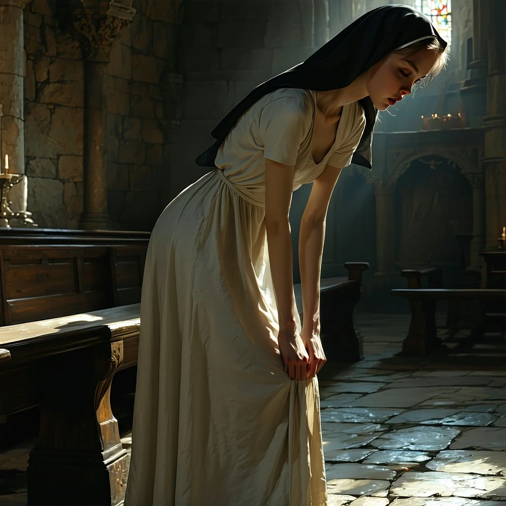 <lora:Expressive_H:1> Expressiveh, <lora:warm light style:1> warm light style, close up, score_9, score_8_up, score_7_up, bending over a bench in a dark room of a church and pulling her robe aside showing her ass, small ass, skinny ass, skinny body, tiny ass, an intimate close-up of a young nun in her 20s, head tilted slightly to the back and looking upwards, exuding an unexpected allure with big lips, her facial expression is lustful and naughty, she offers herself submissively and reveals her naughty intentions, the composition framed slightly from the side, the stone floor of a old church in the background, highly detailed background, ethereal light illuminating the scene, creating a juxtaposition of innocence and lasciviousness; the setting featuring richly textured fabric and subtle religious symbols