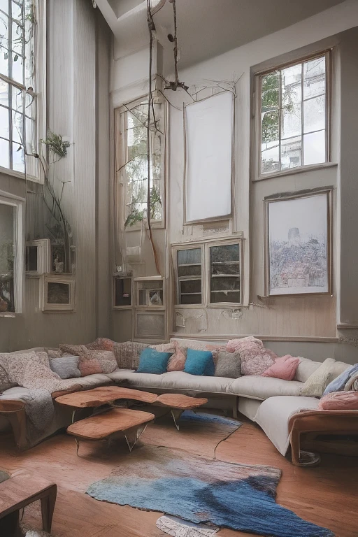 High resolution photography interior design, dreamy sunken living room conversation pit, wooden floor, small windows opening onto the garden, bauhaus furniture and decoration, high ceiling, beige blue salmon pastel palette, interior design magazine, cozy atmosphere; 8k, intricate detail, photorealistic, realistic light, wide angle, kinkfolk photography, A+D architecture