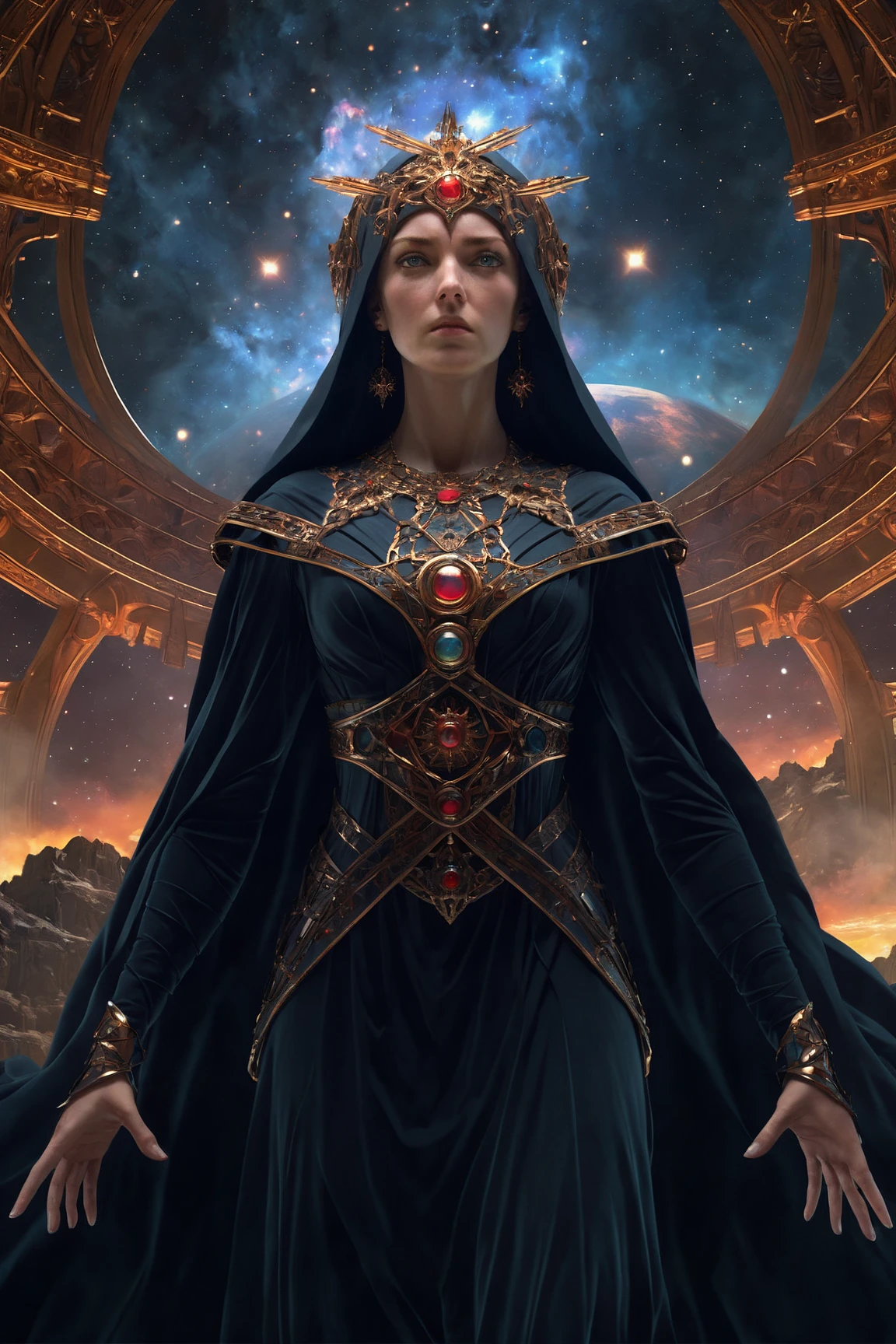 Lady in the ring + beautiful eyes, beautiful face + symmetry face + border and embellishments inspiried by alphonse mucha, fractals in the background, galaxy + baroque, gothic, surreal + highly detailed, intricate complexity, epic composition, magical atmosphere + masterpiece, award winning + trending on artstation , (intricate detail) , (super detailed) , 8k hdr, high detailed, soft cinematic lighting, dramatic atmosphere, atmospheric perspective, torch lighting, ray tracing, starry universe background
