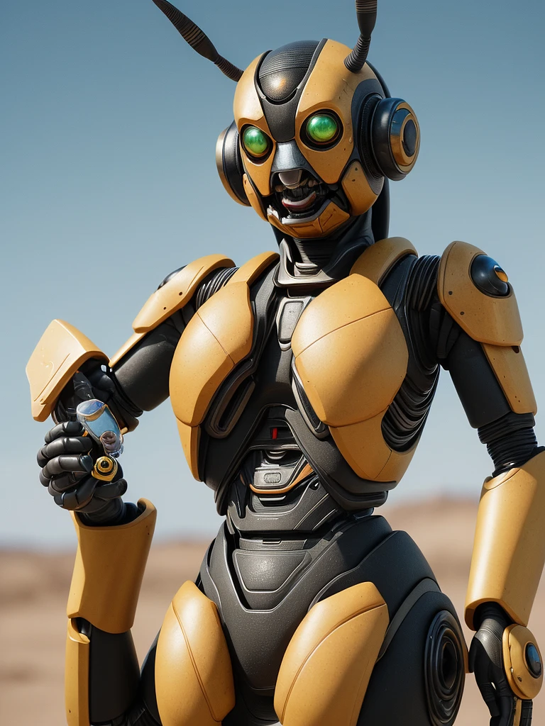 portrait of biorobotic and armed bee, 8k full HD, low angle, unreal engine 5, cinematic, masterpiece, insane detail, real photography, bright colors, sun-soaked colours, Fujifilm X-T4, Sony FE 85mm --ar 900:1600 --s 750 --style raw --v 5. 2