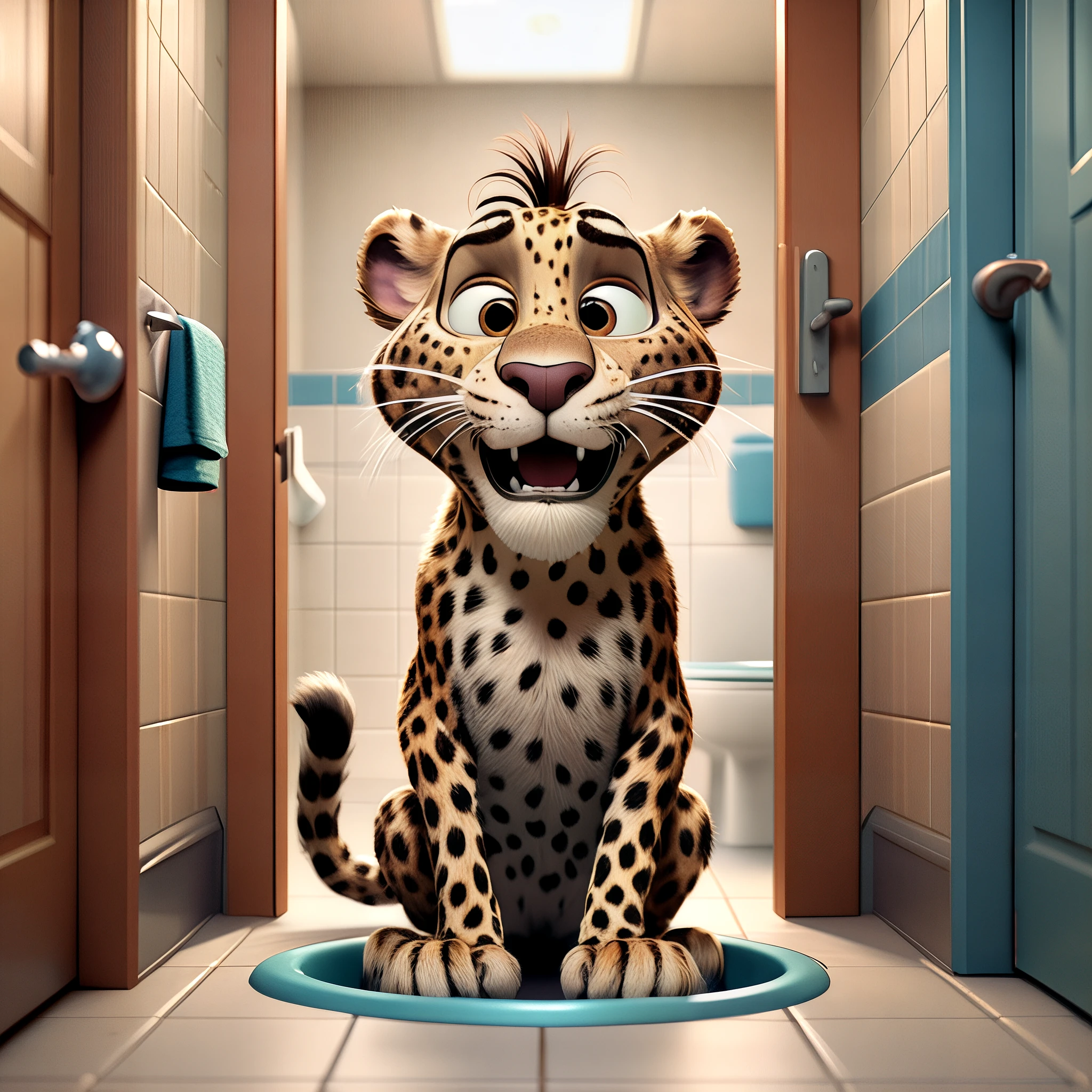 Close-up professional cinematic pixar 3D animation of a long-furred leopard, its face panicked and grimacing in desperation, standing in restroom with a sink and a toilet, opening the door in a tight, urgent pose, 4K