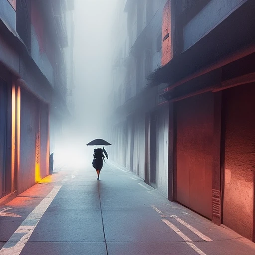 En un callejón futurista nocturno, la neblina danza entre rascacielos envueltos en humedad. Desde una perspectiva aérea, una mujer en atuendo futurista, confeccionado de rastrojos y piezas recicladas, avanza con elegancia. Las luces tenues de edificios distantes atraviesan la densa polución, creando un paisaje intrigante de contrastes entre la innovación y la decadencia.