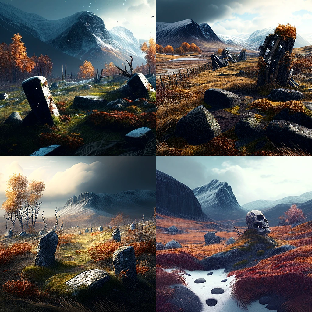 Landscape of an ancient battlefield where centuries ago gods, giants and humans fought. The battlefield is overgrown with moss, skeletons and leaves. The first snow of the season has come, there is some snow on the ground, the season is autumn. In the distance you can see mountains.