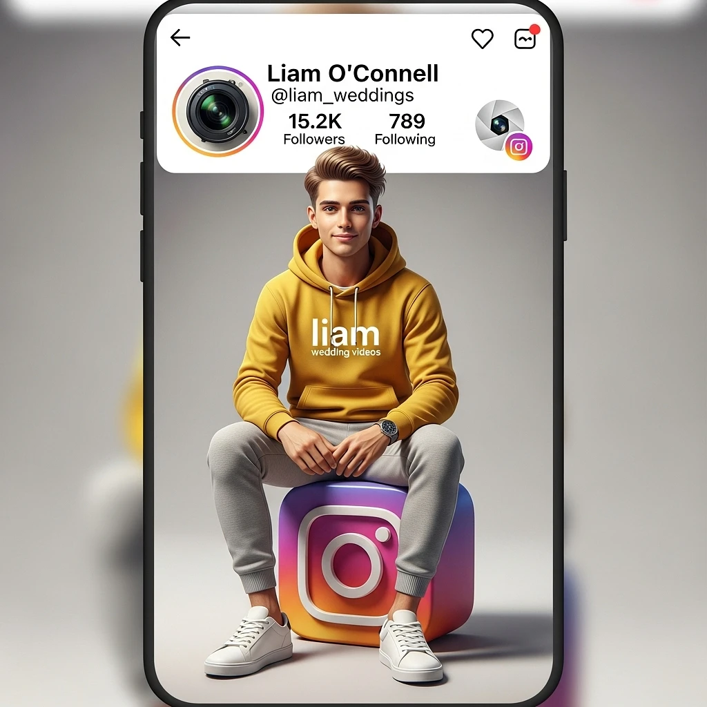 "Create a hyper-realistic image in vertical format 9:16. Show a young man with the appearance of [your face or physical description] and wearing. He is sitting in a relaxed way on a large 3D logo of Instagram in vibrant colours. Wear modern urban clothing: Coloured hoodie [sweatpants colour] with the ' [liam wedding videos] ' logo, jogger pants [pants colour] and sneakers [shoe colour] . In the background, a large profile card of [social network] identical to a real profile appears, with realistic details: name ' [Visible username] ; user '@ [handle] , [number of followers] Followers, [number of following] following and [Other data] . The background should be clear, minimalist style, soft lighting, professional, fresh and youthful look, ideal as a social network cover. "