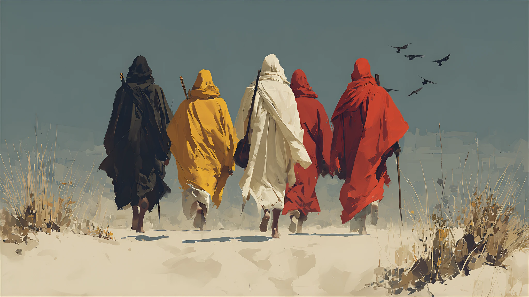 Five middle-aged people of unspecified ethnicity, clad in flowing, colorful garments – black, yellow, cream/off-white, and red – walk in a desert landscape. The garments are loose-fitting, hooded, and appear to be made of a fabric that drapes in folds. The figures are seen from behind, walking in a line, their bodies and posture suggest a moderate pace and a shared direction of travel. They each carry walking sticks. The desert sand is a light beige color, with scattered patches of low vegetation. The background features a large expanse of a muted sky, bluish-gray, with some suggestion of a distant, city-like structure. Birds fly overhead. The light appears to be coming from a source above the scene, casting soft shadows and highlighting the figures. The composition is centered on the group and slightly high angle. The overall style is stylized and painterly with a slightly dramatic, epic tone, and emphasizes the figures' movement across the vast expanse. The colors are rich and vivid.
