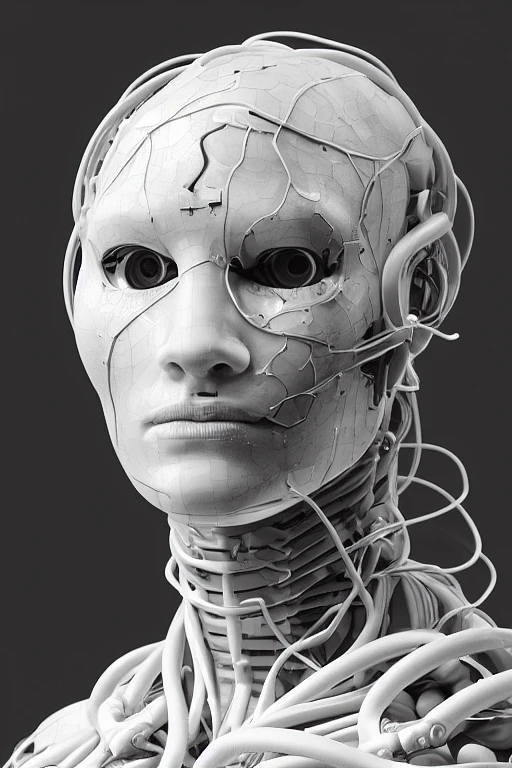cyborg woman| with a visible detailed brain| muscles cable wires| biopunk| cybernetic| cyberpunk| white marble bust| canon m50| 100mm| sharp focus| smooth| hyperrealism| highly detailed| intricate details| carved by michelangelo