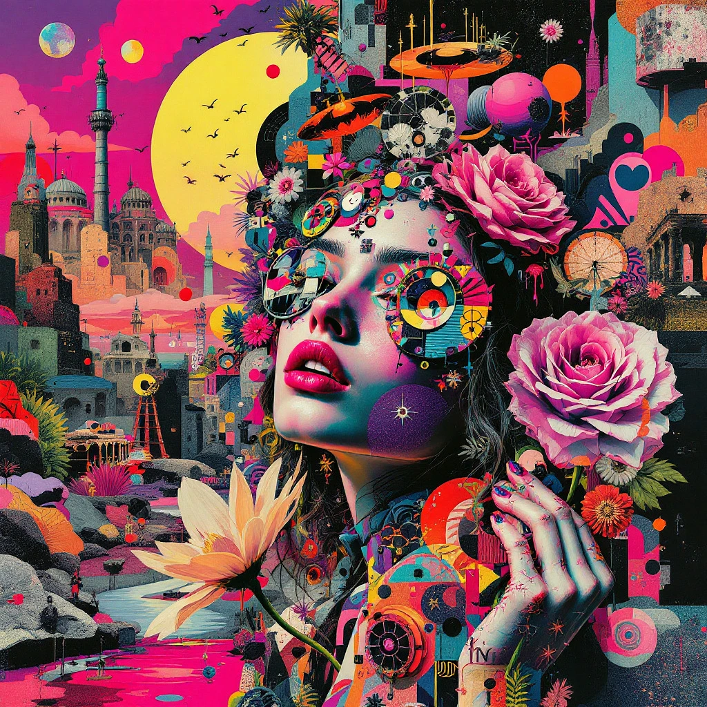 A Dadaist collage of a post-apocalyptic world in neon tones and 4K resolution. a young lady holding a flower.