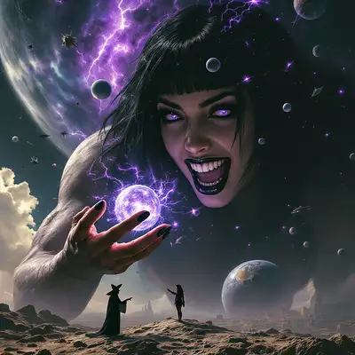 A Giga Giantess, Beautiful Goddess, her IMMENSE UNSTOPPABLE power expands out of the GALAXY, with a GIGANTIC, Volumptious long afro hair, curvy, anime, huge glowing rainbow eyes, huge extra chest, very big thighs, smirk, crazy, holding the universe.