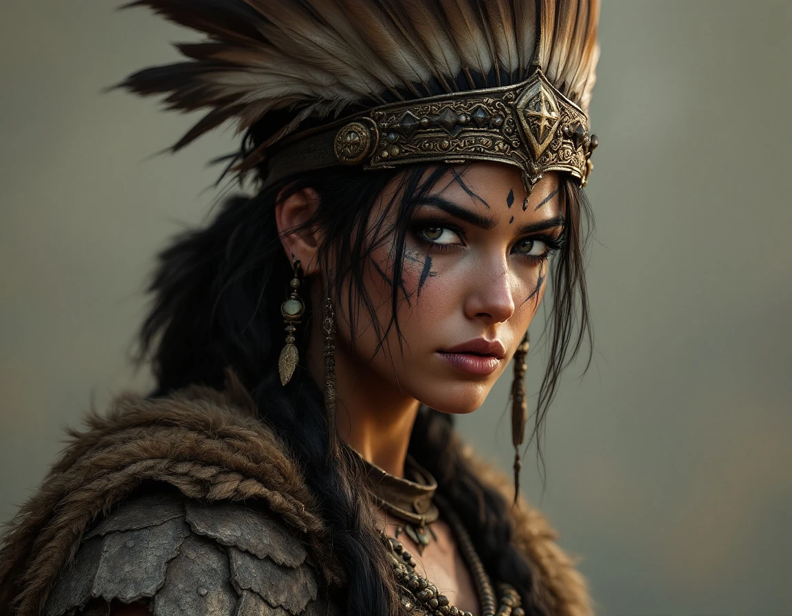 A female warrior with dark hair and facial tattoos, wearing a headdress of feathers, full-body portrait, in the style of digital art. --ar 1:2 --raw --profile ypzng3s 8ynq7t9 wwhp8ky --stylize 600 --v 7