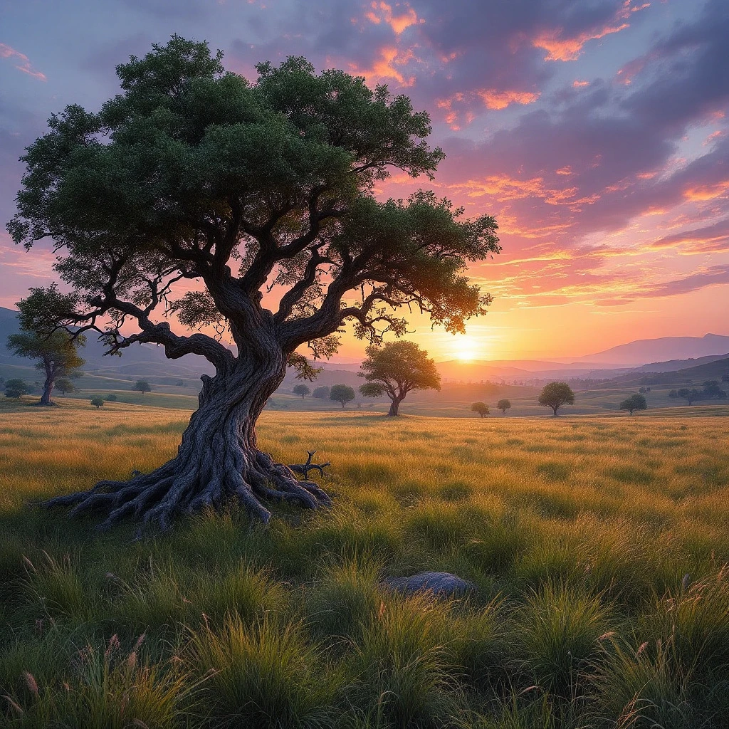 a sprawling ancient field at the brink of dusk and dawn, where grass sways gently in the breeze, painted in hues of gold and green, trees with gnarled trunks and twisted branches, their leaves shimmering in the soft light, the light of the setting and rising sun casts dramatic shadows, the sky is a breathtaking palette of deep orange, soft pink, and twilight purple, creating an ethereal backdrop,