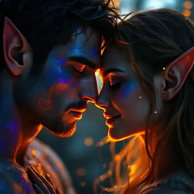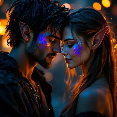A raw, hyper-realistic cinematic headshot of two elf lovers in an intimate embrace. Their faces are close, almost touching, covered in vibrant, abstract paint strokes in shades of deep blue, rich purple, and fiery orange. The male elf has dark, tousled hair, sharp angular features, and a strong jawline. His clean-shaven face (clean shaven) glows softly under the dim, moody lighting, his eyes closed as he leans into the embrace with deep emotion. The beautiful elf young women has long, silky golden hair gently against his. The dim, atmospheric lighting casts a warm, golden glow, enhancing the depth of their connection. The background is blurred, with soft bokeh lights creating a dreamy and magical ambiance. The hyper-detailed textures, from the visible paintbrush strokes on their skin to the soft glow of their features and the sharp, crisp composition, man has clean shave smooth face , make the moment feel raw, passionate, and breathtakingly intimate. "