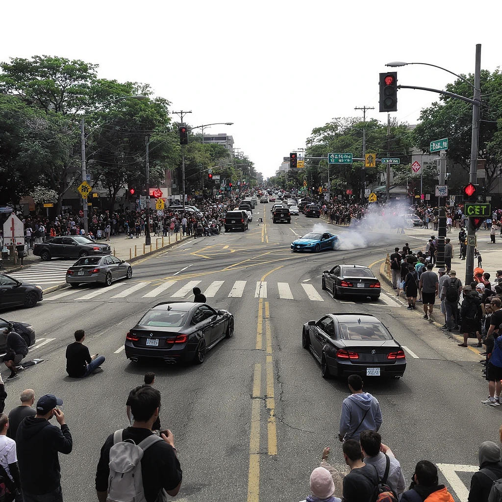 Hyper-realistic image of a gathering where people block off a public intersection to perform stunts like drifting and racing, isolated on a white background.