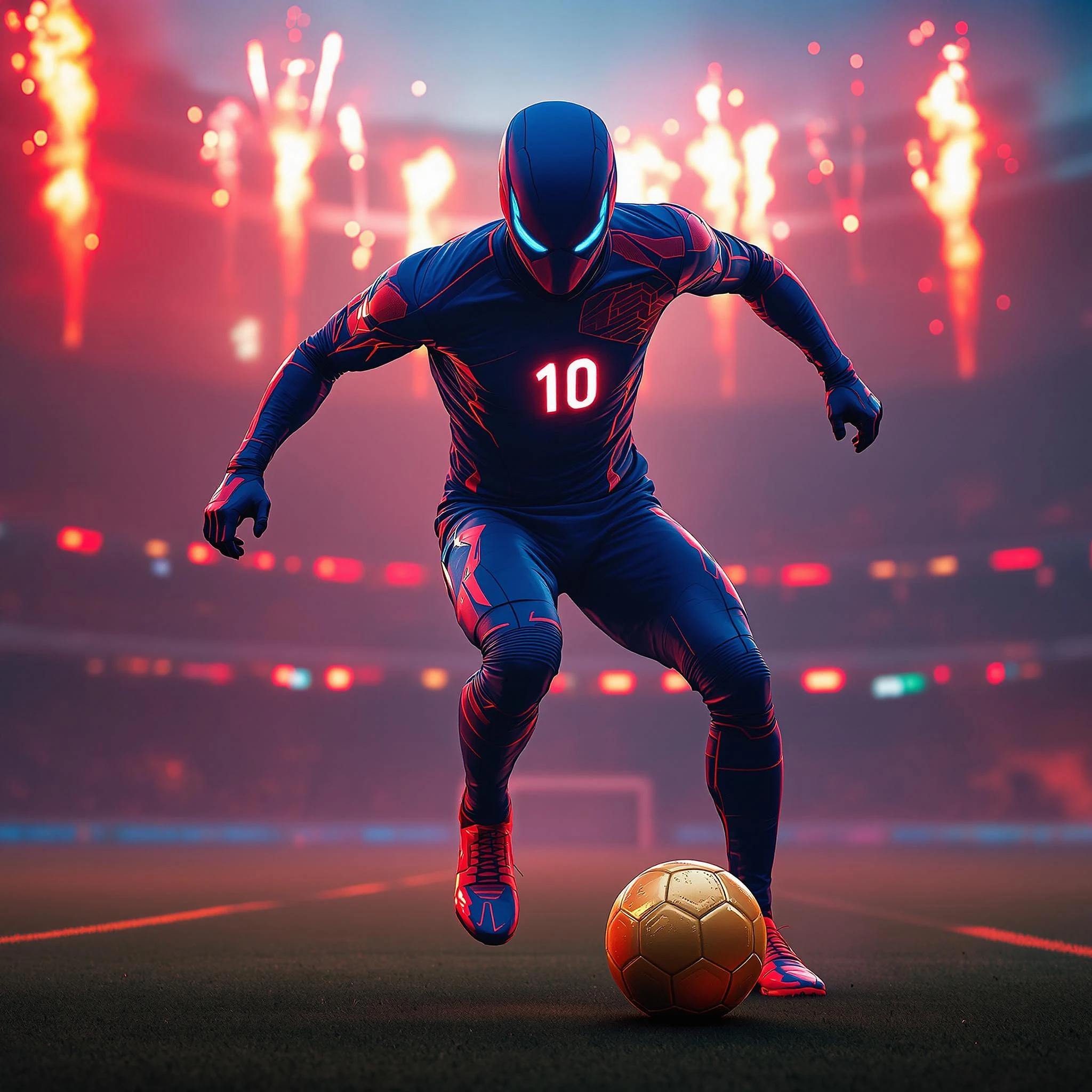 FUTURE SOCCER PLAYER IN A TIGHT BLUE RED SUPERHERO SUIT WITH A FACE MASK AND THE NUMBER GLOWING TEN ON IT LIKE ON A FOOTBALL JERSEY, POWER DRIBBLING IN MOTION, DARK SMOKY ATMOSPHERE, LIGHTS IN THE BACK, POWERFUL MOVE, GOLDEN BALL IS GLOWING, HQ, HYPER REALISTIC, FULL BODY, DARK FUTURERISTIC FOOTBALLFIELD WITH GLOWING LINES, FIREWORKS AND EXPLOSIONS IN THE BACK RED BLUE SKY BEHIND STADIUM, CYBERPUNK, CINEMATIC