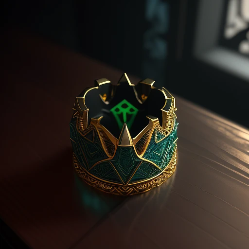 necklace Ring on the table with the design and character of batman The necklace Ring is gold and bluecdark, no watermark, no copyright, high gloss, highly detailed, intricate, green scrollwork, unreal engine 5, octane render, lumen reflections, quixel megascan, 8k, studio lighting, —ar 1080:1920