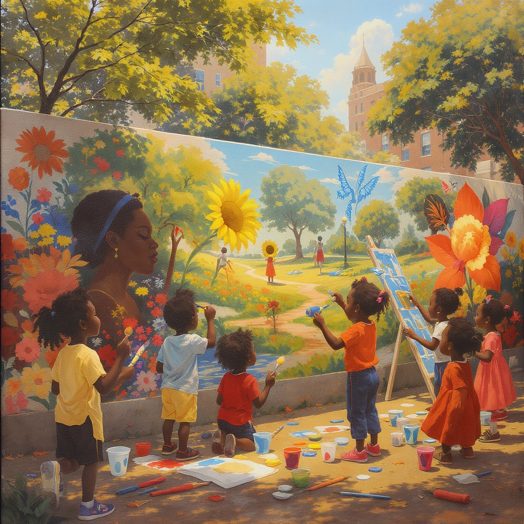 A group of African American children are gathered around a vibrant mural, painting with brushes and rollers, their faces lit with joy and determination. The mural depicts scenes of community, nature, and empowerment. The scene is set in a sun-drenched urban park, with lush trees and colorful flowers adding to the lively atmosphere. Rendered in the style of Kadir Nelson, with rich, saturated colors and thick brushstrokes, reminiscent of a vintage oil painting with a touch of magical realism.