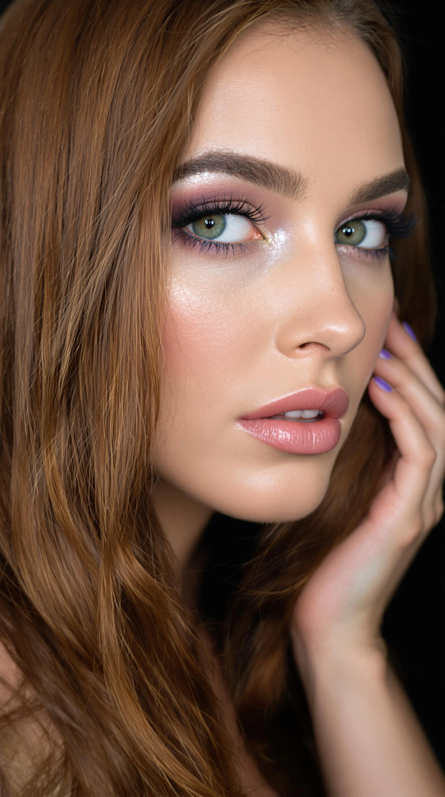 "The image is a striking close-up portrait of a woman with lustrous, chestnut brown hair cascading like a silken waterfall over her slender shoulders. Her alabaster skin radiates a gentle luminescence, enhancing her ethereal beauty. Large, soulful emerald green eyes, framed by meticulously sculpted eyebrows, and adorned with a shimmering amethyst eyeshadow, adding a touch of mystique. Her lips, full and inviting, are painted in a delicate rose hue, subtly completing her enchanting allure. The background is a rich, velvet black, which adds depth and drama to the composition, allowing her features to stand out in mesmerising focus. "