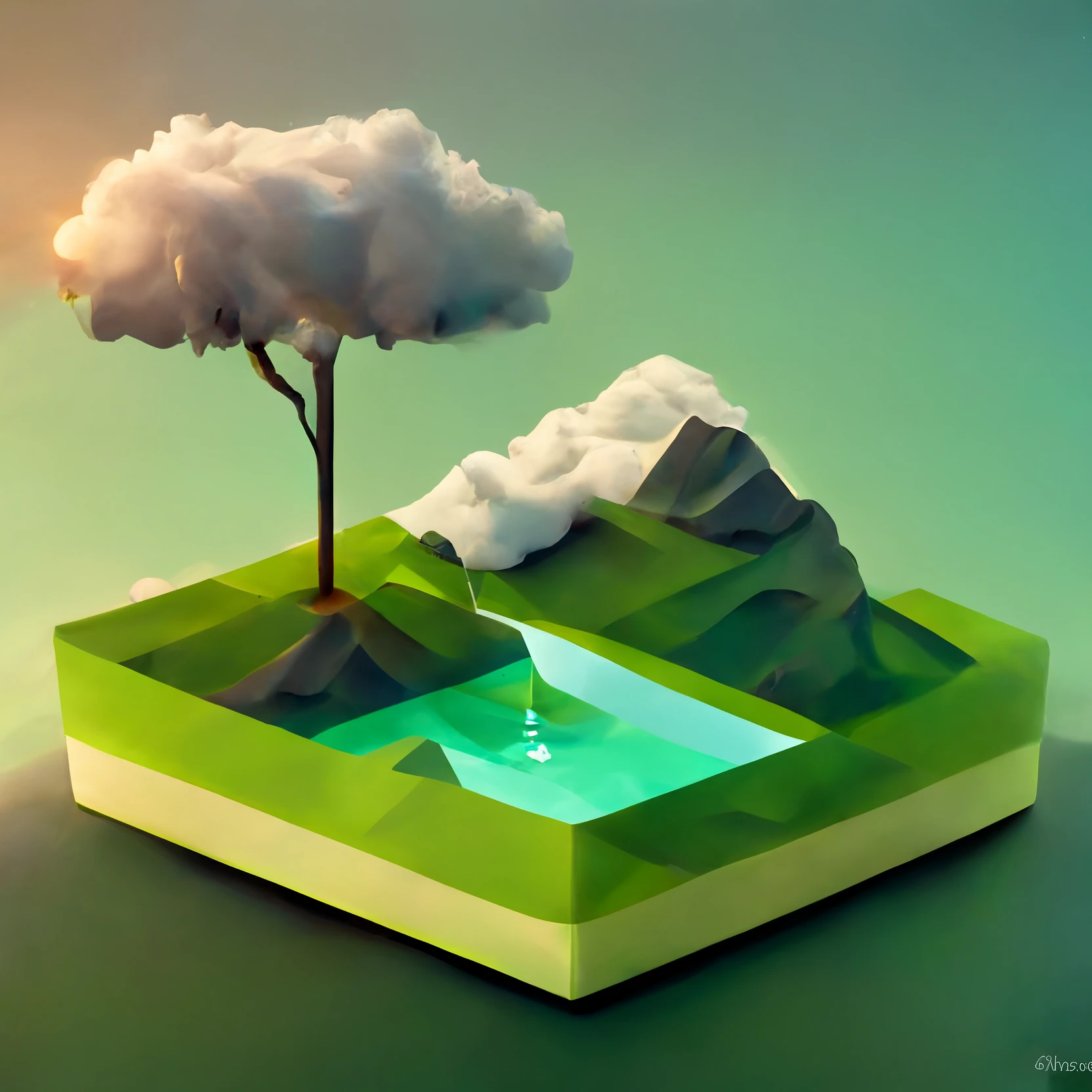 isometric landscape, water refraction, mountain, tree, grass, cloud, bright mood, octane render, isometric landscape in the cube, ar 1:1
