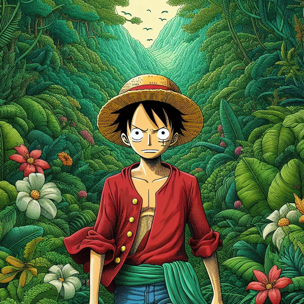Generate an image that captures the adventurous essence of Luffy in the middle of the lush jungle. The character must have distinctive features of Luffy such as his straw hat and his red shirt that he leaves open. The vegetation must be rich and detailed, with various shades of green and flowers scattered to add touches of color. The artistic style must be similar to that of Studio Ghibli, characterized by its attention to detail and its vibrant colors