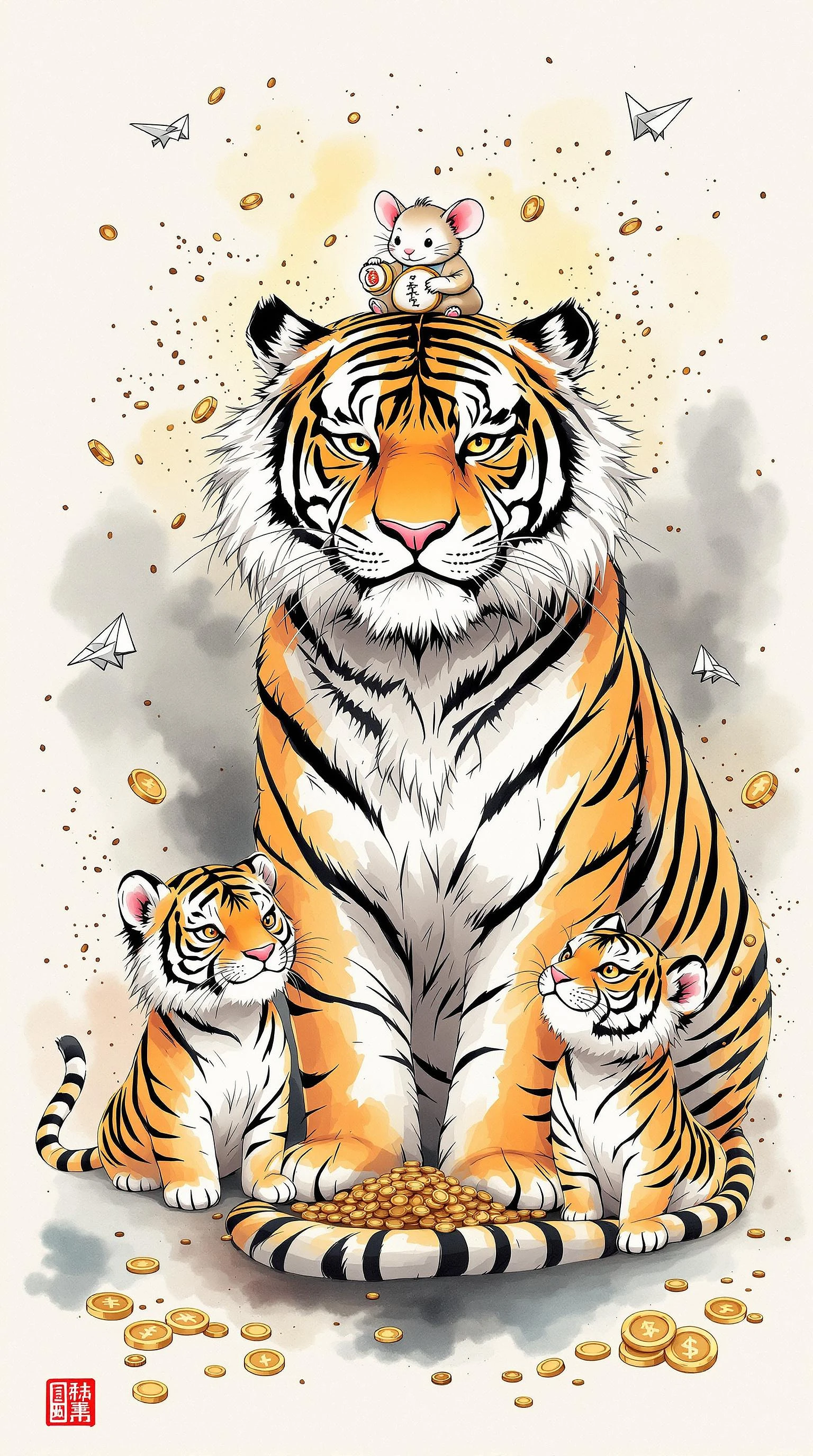 A big tiger and two little tigers, with a mouse on the big tiger's head, the mouse holding a talisman, the tiger holding a money bag, scattered copper coins and gold beans in the background, paper airplanes in the background, ink splashes above, rich in details, the tiger is the main subject, ink swirling around its body, in an ink wash style,masterpiece, best quality, original, wallpaper, colorful, covr, everyone, gradient_background, huge_filesize, highres, traditional_media, fine_art_parody, head tilt, ink style,watercolor_ (medium) ,