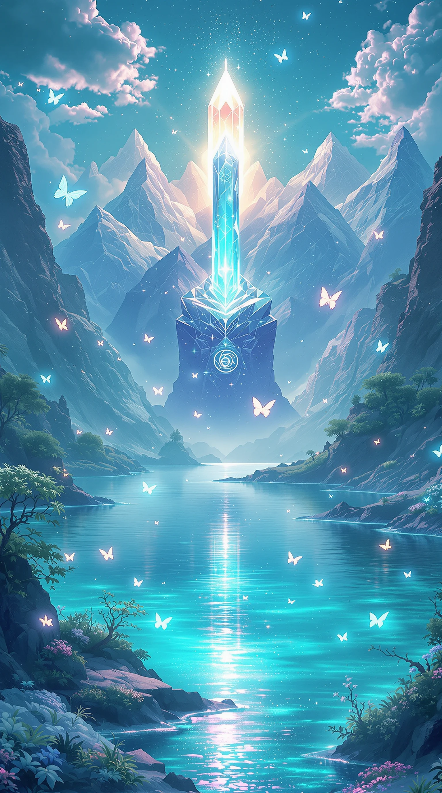 A **breathtaking, dreamlike fantasy landscape**, bathed in **mesmerizing shades of turquoise**, where **crystal-clear waters shimmer with an ethereal glow**. The scene exudes an **otherworldly, mystical presence**, as though it exists in a **realm untouched by time**. In the **distance, towering mountains with translucent, gem-like peaks** rise **majestically**, their **turquoise-hued surfaces reflecting the sky’s soft gradients of teal and cyan**. The **light refracts through the crystal peaks**, creating a **prismatic display of shimmering blues and greens**.