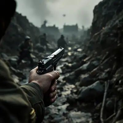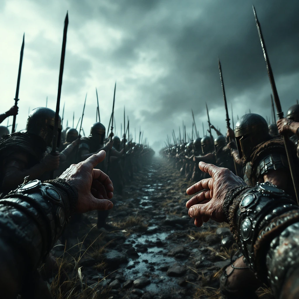 An ultra-realistic point-of-view (POV) image capturing the first-person perspective of a Spartan soldier on a battlefield. The character's hands and body parts are visible, creating a sense of immersion, as if the viewer were actually there. The scene is detailed, with cinematic lighting and an authentic atmosphere that transports the viewer to that time and place.
