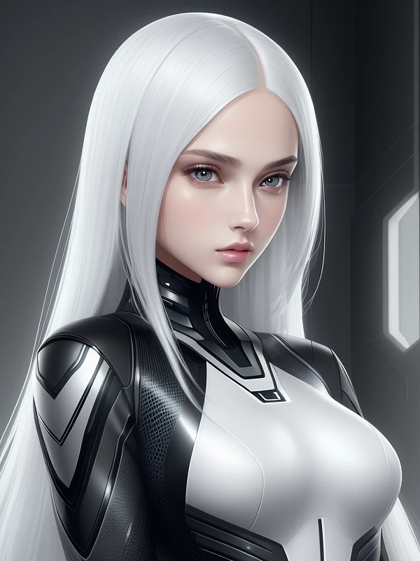 Beautiful young girl. (In full growth.) Slender body. Amazing face. Symmetrical eyes. Fantastic eyes. Detailed eyes. Detailed face. Minimalistic futuristic cyber suit. Detailed suit. Realistic. High quality picture. Detailed picture. Masterpiece. ArtStation. A high resolution.