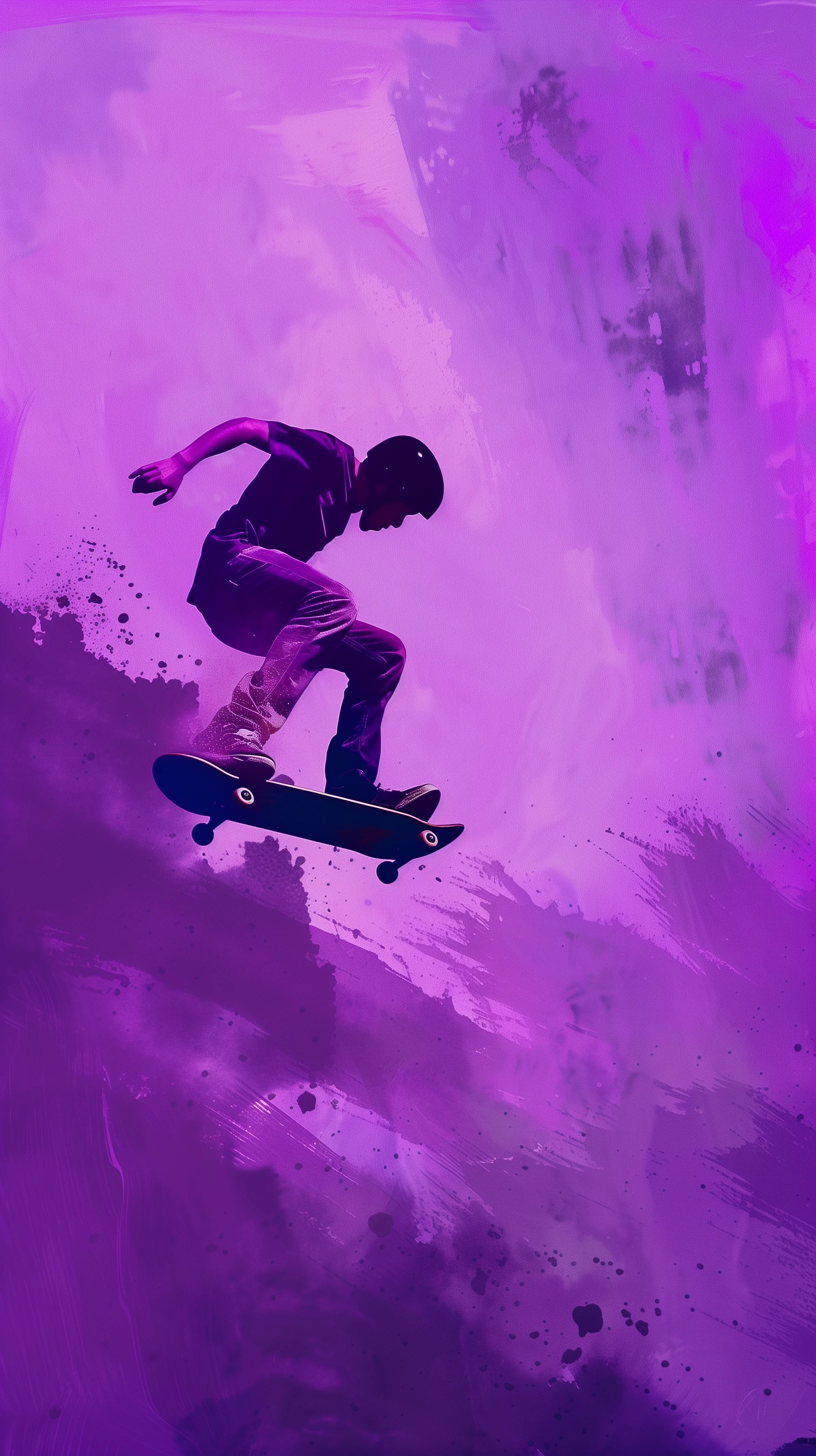 vivid depiction of a skateboarder in mid-jump, dynamic angle highlights the motion, background in a gradient of purple, sports and youth culture themed, energetic and youthful vibes with a focus on movement and style --ar 9:16