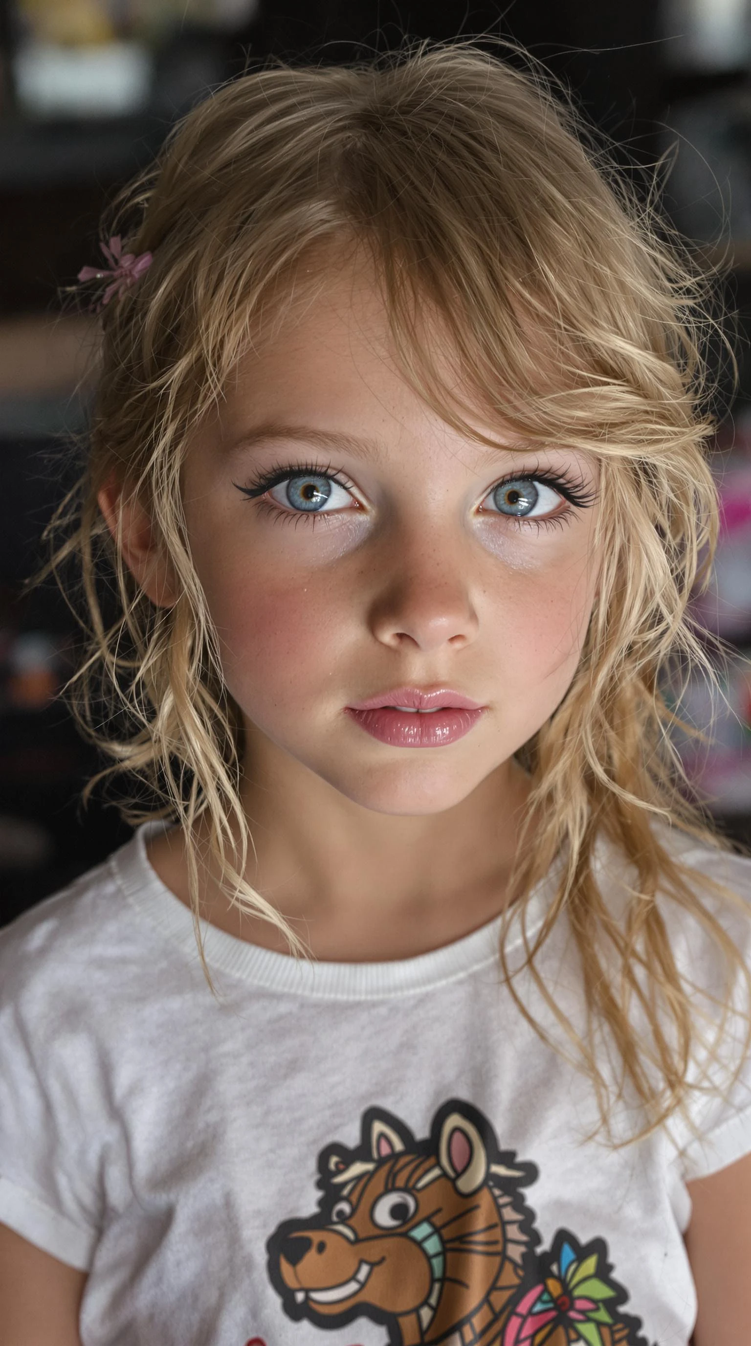 a professional photo of a exceptionally beautiful girl in the world (age 7) , (seven year old) Taylor Swift look alike, in a highly detailed, futuristic, (futuristic) , (masterpiece) , (realistic) , (perfect by age anatomy) , (Full body) , (facing the viewer) , (viewing from head to feet, beautifully flawless medium olive skin, thick black eye liner, blue eye shadow, extra long eye lashes, light pink blush, extremely beautifully shaped lips with light pink lipstick, blue eye shadow, perfectly flawless olive skin, beautiful perfect high cheekbones extremely detailed large perfectly shaped beautiful brilliant Forest Tea blue-brown-golden-grey eyes, beautifully manicured fingernail with pink polish, (wearing a white t-shirt, skinny jeans, and brown cowboy boots) high depth of field, gentle expression, 8k, (high res) , ultra-detailed, photo-realistic, full image view, full body view, front view, highly detailed, volumetric, dramatic lighting
