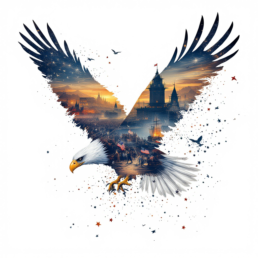 8K, highly detailed, high quality breathtaking double exposure illustration features a bald eagle soaring silhouette. Inside the silhouette is a scene of important battle for Independence in 1776. The intricate details of the bald eagle soaring silhouette are rendered with impeccable anatomy, while the vibrant colors and textures contrast against the stark white backdrop.