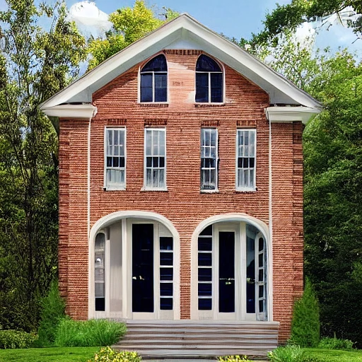 hyper realistic eye level exterior photo of a brick house house, daylight, indirect lighting, sidewalk, cozy, magazine exterior photo, better home and garden, large windows leading to garden, heavy inviting doors, roof lined by gutters, suburbia southern