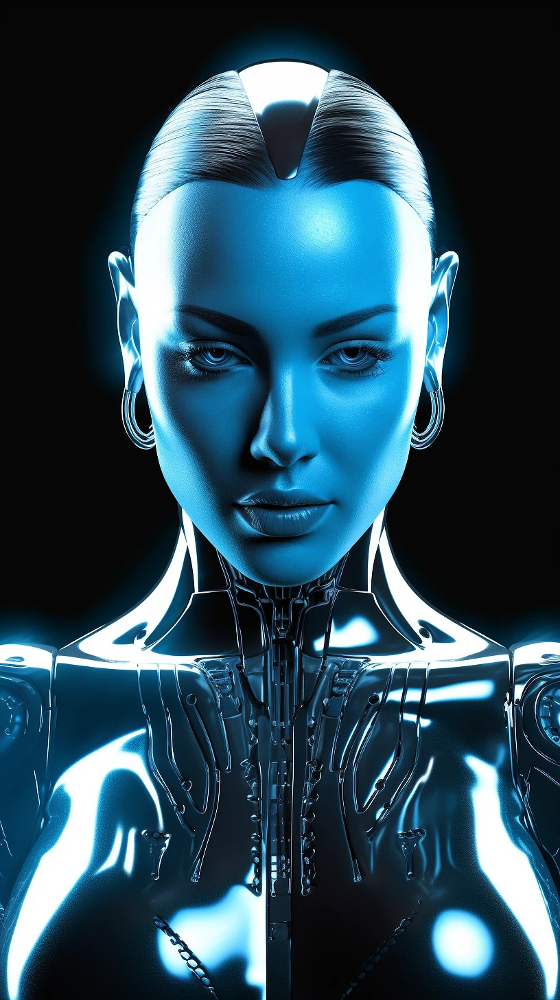 the 3d graphic depicts a woman in a futuristic outfit, in the style of liquid light emulsion, azure, close-up intensity, sleek metallic finish, neon realism, elegant, emotive faces, high contrast lighting --ar 51:91 --style raw --s 750 --v 5. 1