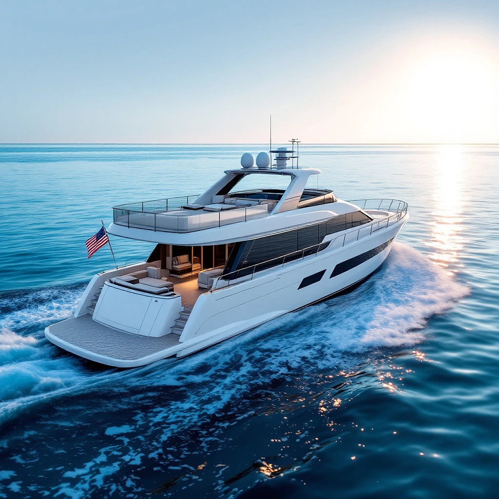 Create a high-resolution photo of a 76' 2005 Lazzara Enclosed Flybridge yacht. The yacht should be shown cruising peacefully on calm, crystal-clear blue waters. The yacht's exterior should showcase a sleek and modern design, with a polished white hull and large, tinted windows. The enclosed flybridge should be visible, featuring a state-of-the-art control area with a panoramic view. The deck should offer luxurious lounging spaces with plush seating. The background should include a clear sky with a gentle sun, emphasizing the yacht's elegance and grandeur.