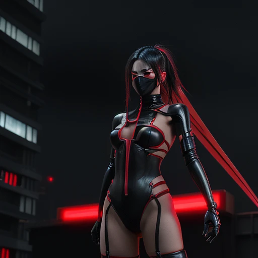 a female assassin ninja in red and black ninja outfit, at night, black and red buildings , cyberpunk, fluorescent light, dynamic color palettes, , raining, anime inspired, hybrid art, (hyperrealism:0. 5)