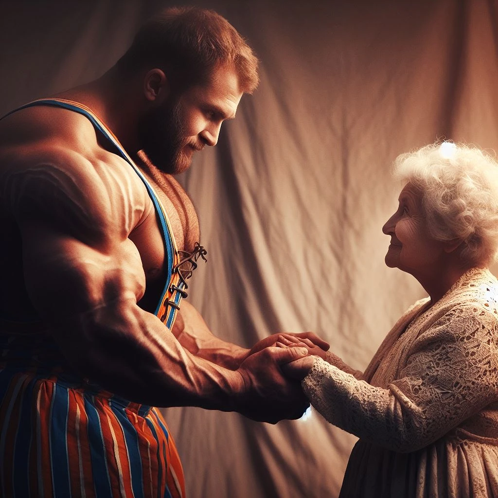 A circus strongman, holding hands with his sweet mother, convey the contrast of frailty and strength