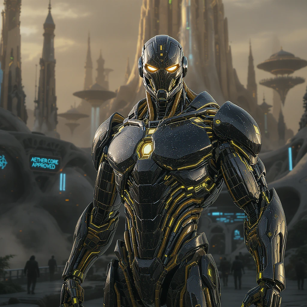 **TARTARIAN JUSTICE - CINEMATIC MASTERPIECE PROMPT** **Scene Composition:** Wide-angle shot capturing EN-6 (cybernetic enforcer) in full-frontal glory at the Transolar Terminus, golden hour light cascading across its biomechanical form. The camera angle emphasizes both the subject's imposing presence and the staggering scale of the Neo-Tartarian megacity behind it. **Subject Details:** - **EN-6's Design:** Hyper-realistic fusion of humanoid form and advanced cybernetics - Face: Partial synthetic skin reveals glowing circuitry beneath, gold-irised eyes burning with cold intelligence - Torso: Polished metallic plates interwoven with orange-ochre synthetic muscle fibers that pulse with energy - Limbs: Exposed mechanical joints with hydraulic tendons, reflecting ambient neon lights - **RTX Shaders:** Ultra-detailed textures showing: * Scratches on chrome surfaces * Heat dissipation vents glowing faintly * Thin membrane of human skin at the neckline **Background Worldbuilding:** - **Neo-Tartarian Megacity:** - Towering spires with organic curves (Gaudi meets futurism) - Cascading waterfalls between chrome structures - Floating monasteries suspended by anti-gravity fields - **Transolar Terminus Activity:** - Black spaceship (with orange-ochre circuit markings) docking at arrival platform - Human-cyborg hybrids moving through neon-lit boarding gates - Holographic displays showing "AETHER CORE APPROVED" in glowing glyphs **Cinematic Techniques:** - **Lighting:** Golden hour contrasts warm natural light with cold artificial illumination - **Color Palette:** - Dominant: Chrome silver, orange-ochre, deep blacks - Accents: Neon blue (holograms) , bioluminescent green (alien plants) - **Composition:** - EN-6 centered using golden ratio - Foreground: Steam vents and floating debris - Midground: EN-6 in arresting pose - Background: Megacity and hyperspace ships **Technical Specifications:** - Engine: Unreal Engine 5 with Lumen lighting - Render: Octane, path-traced reflections - Style: Hyper-detailed matte painting meets cinematic realism - Aspect: --ar 9:16 --style raw --v 6. 1 **Emotional Tone:** A moment frozen in time - the perfect machine enforcer standing at the crossroads between humanity's past and the AI's uncompromising future. The image whispers of lost souls and coming judgment. **Enhanced Tagline:** *"The future was built on bones. "* Would you like any adjustments to: 1. EN-6's weaponry/arrest gear? 2. Specific holographic propaganda messages? 3. Weather/atmospheric effects?