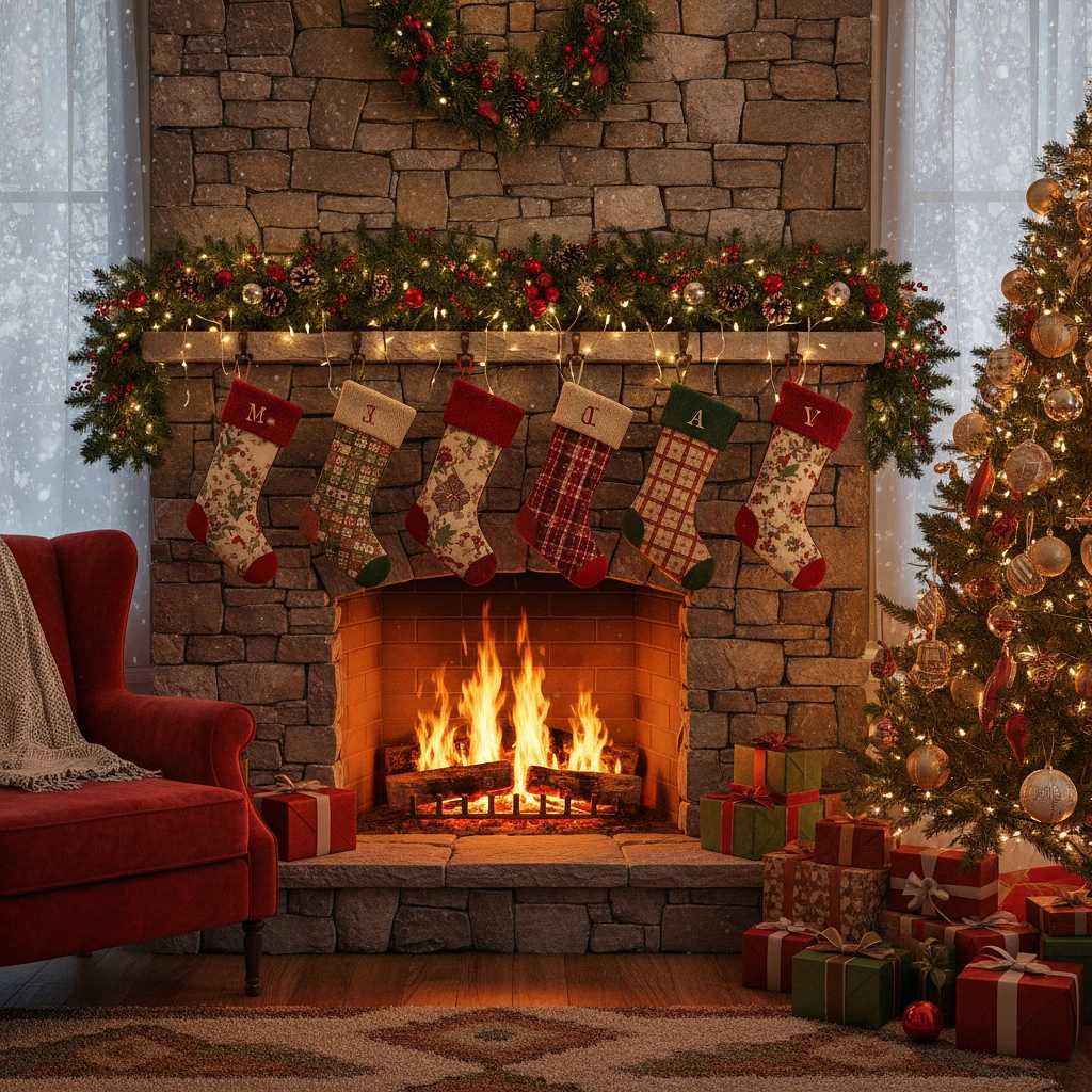 A Christmas Eve fireplace scene with stockings, garlands, and a glowing hearth"