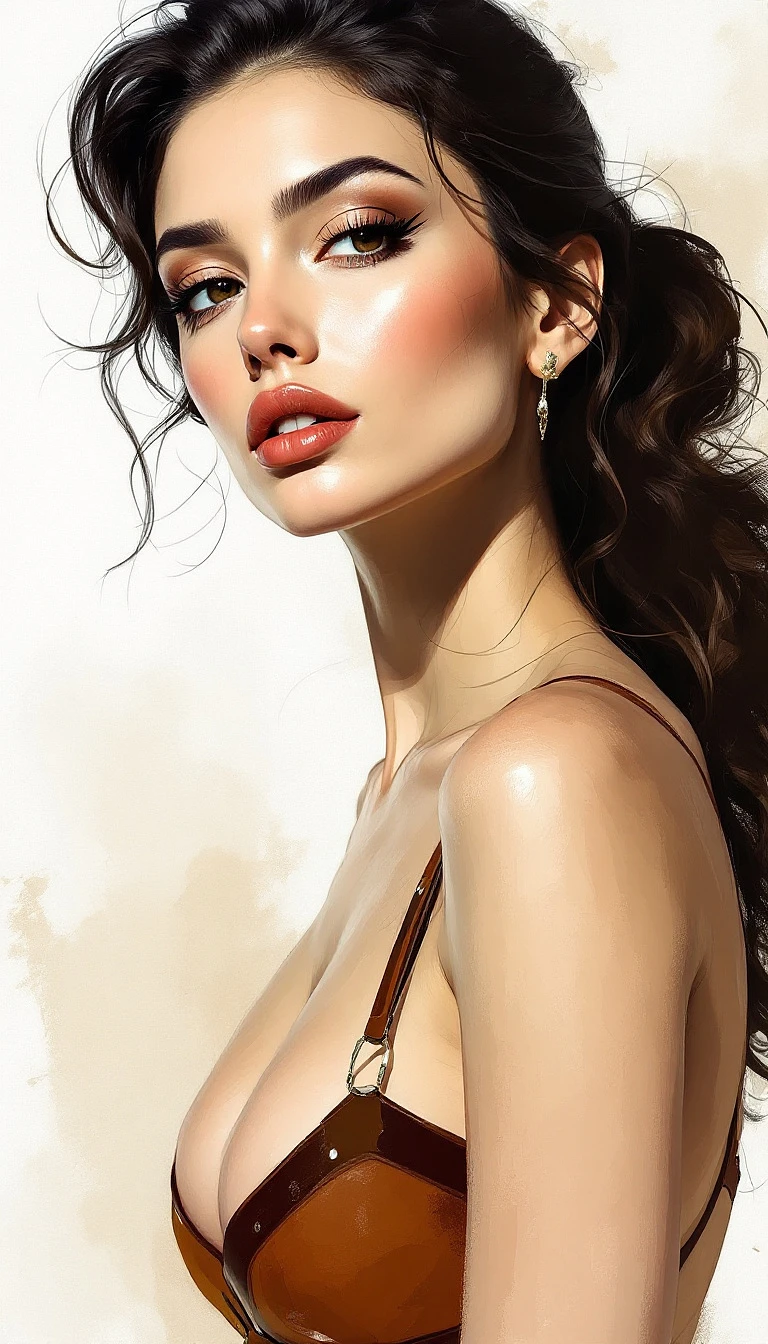 "Elegant Form in a Stark Canvas": A striking woman is shown against a plain, white background, her contours and lines portrayed with powerful, expressive strokes. The image is dominated by shades of light vanilla and rich, dark walnut, while gentle forms and lines give a feeling of subtle charm. The model's pose is both assured and inviting, appearing to draw in those who observe the scene. Rendered with intentional precision and creative inspiration, this artwork has a bold effect inspired by the style of Frazetta, conveying both strength and allure.