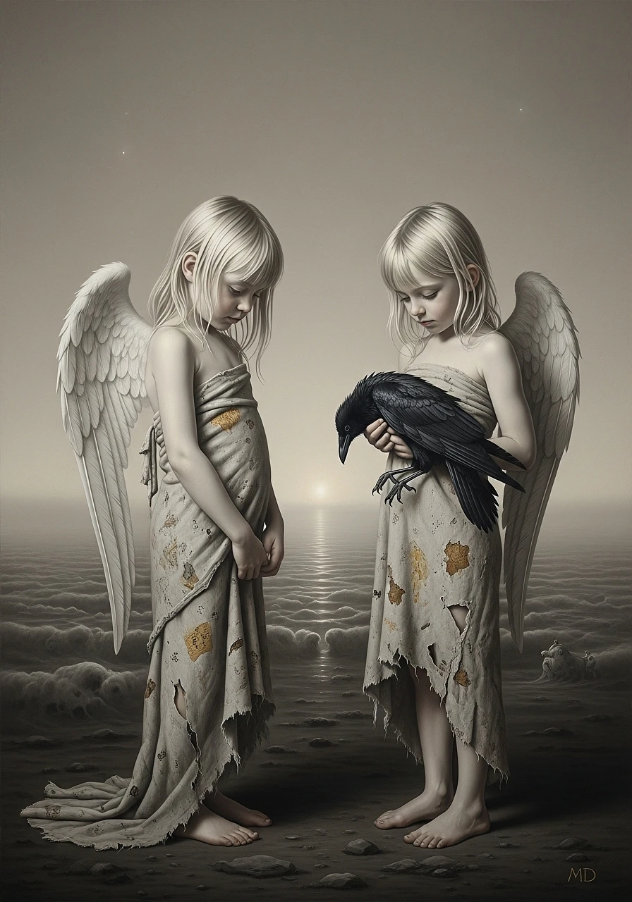 Super Magisch realisme in only total grey tones paint Craft an new Master painting-style image a two verry skinny young 14 y blond girl, her body fifth covered in old white wide extreme torn cotton, in the background the light of to sea of emptiness, back pose, she look this way, with angel-wings, one looks at her hands to a real dead raven, realisme, in the realistic painting style of Marco Dankers "MD" in gold