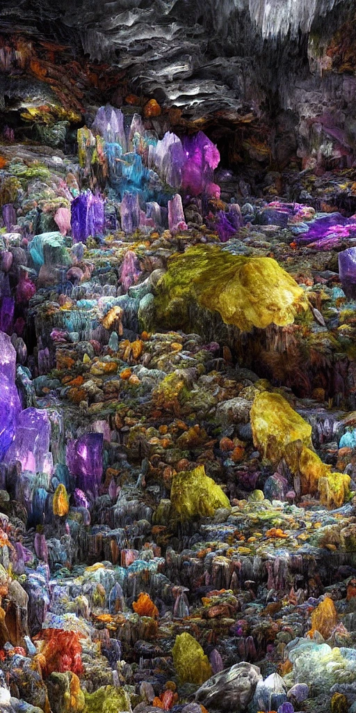 ultra realistic illustration and highly detailed digital render of panorama view in a dark underground cavern rich in huge colorful crystal deposits by Albert Bierstadt, colorful crystals, highly detailed, vibrant and vivid, smooth, crystals, gems, geode, darkness, minereal deposits, cinematic, high contrast, hdr, 4k, trending on artstation, unreal engine, magical, hyperrealistic, bokeh, dof