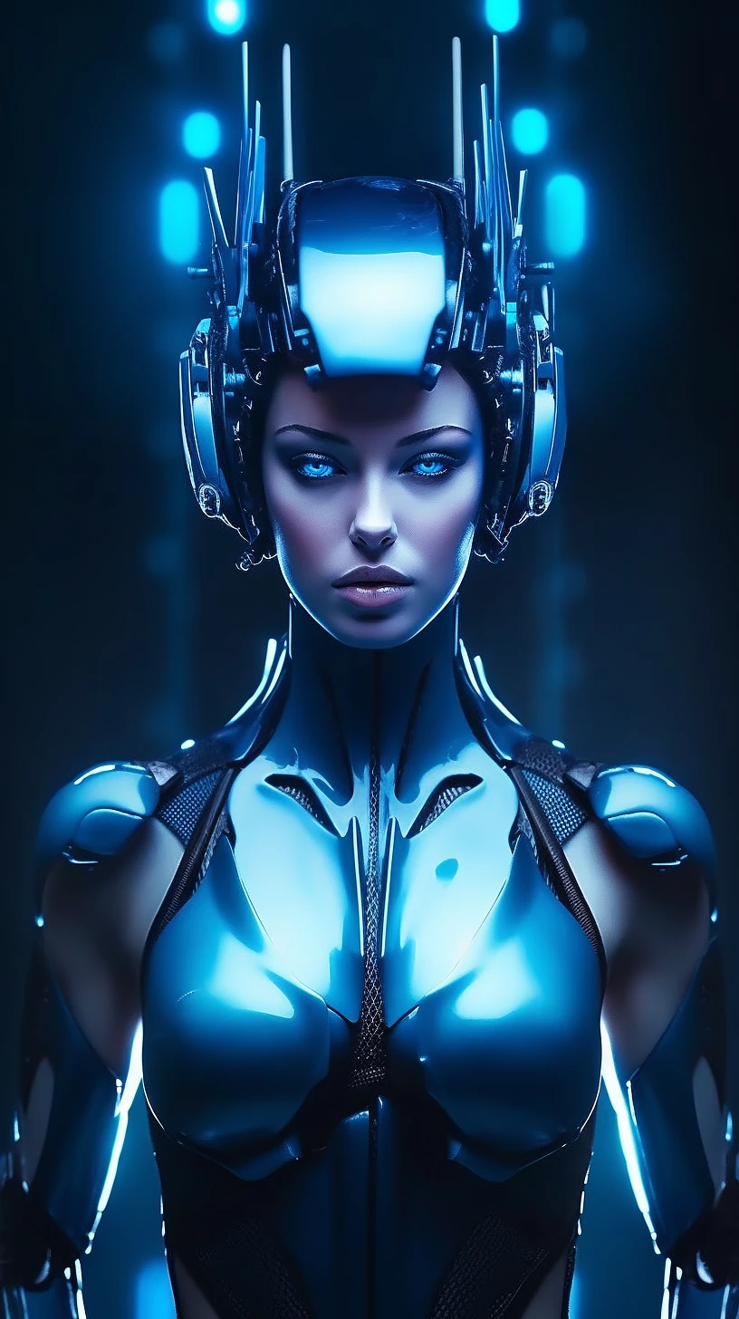 advertisung photo robotic woman in futuristic uniform, in the style of neon realism, matte photo, iris van herpen, 8k resolution, feminine body, dark brown and blue --ar 51:91 --style raw --s 750 --v 5. 1