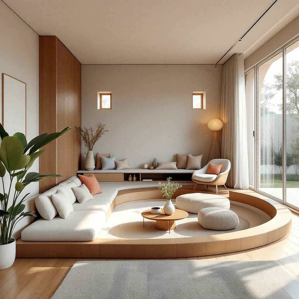 High resolution photography interior design, dreamy sunken living room conversation pit, wooden floor, small windows opening onto the garden, bauhaus furniture and decoration, high ceiling, beige blue salmon pastel palette, interior design magazine, cozy atmosphere; 8k, intricate detail, photorealistic, realistic light, wide angle, kinkfolk photography, A+D architecture